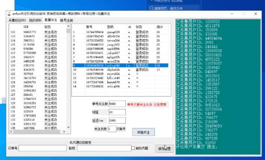 acfun批量关注引流协议软件 支持自动采集 批量注册账号 自动修改资料 批量关注 多线程运行日关注几十万+