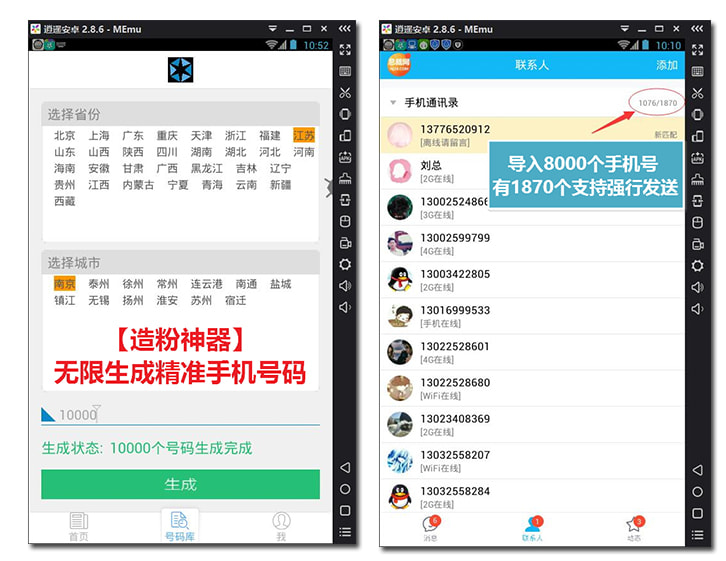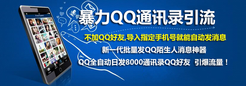 手机QQ通讯录发消息神器:”一款向指定手机号发陌生QQ消息的营销软件“ 亮点:无需QQ加好友,无需对方QQ支持临时会话,只要QQ绑定了手机就能发通讯录陌生消息!日发8000,暴力引流! 功能: 1.自动打码登录 2.自动切换QQ号 3. 自动更换设备码IMEI(防封) 4.自动清理痕迹(防封) 5.自动生成导入手机号(3亿精准数据) 6.自动发送QQ通讯录消息(不加好友直接发陌生消息) 7.自动发送QQ好友消息 8.自动回复收到的消息 9.其他,自由设置发送数量/发送间隔时间/支持随机汉字/排除已发不重复发给同一个人 使用流程:(不会的包安装,无效包退,诚信第一) 购买后下载软件包(内含教程),先安装逍遥模拟器,安装APK后为开通VIP,然后一键生成并导入上万手机号码到通讯录,启动软件会全自动登陆手机QQ向通讯录里的人挨个发送陌生人消息,发完切换下一个QQ继续发送,一天可发10000左右陌生通讯录消息。引爆你的流量![注意:是手机绑定过QQ的手机号能收到通讯录消息,未开通的QQ通讯录里不显示,经测试10万个手机号约有3万可直接发消息!效果比客户端QQ发陌生人临时消息好100倍!]